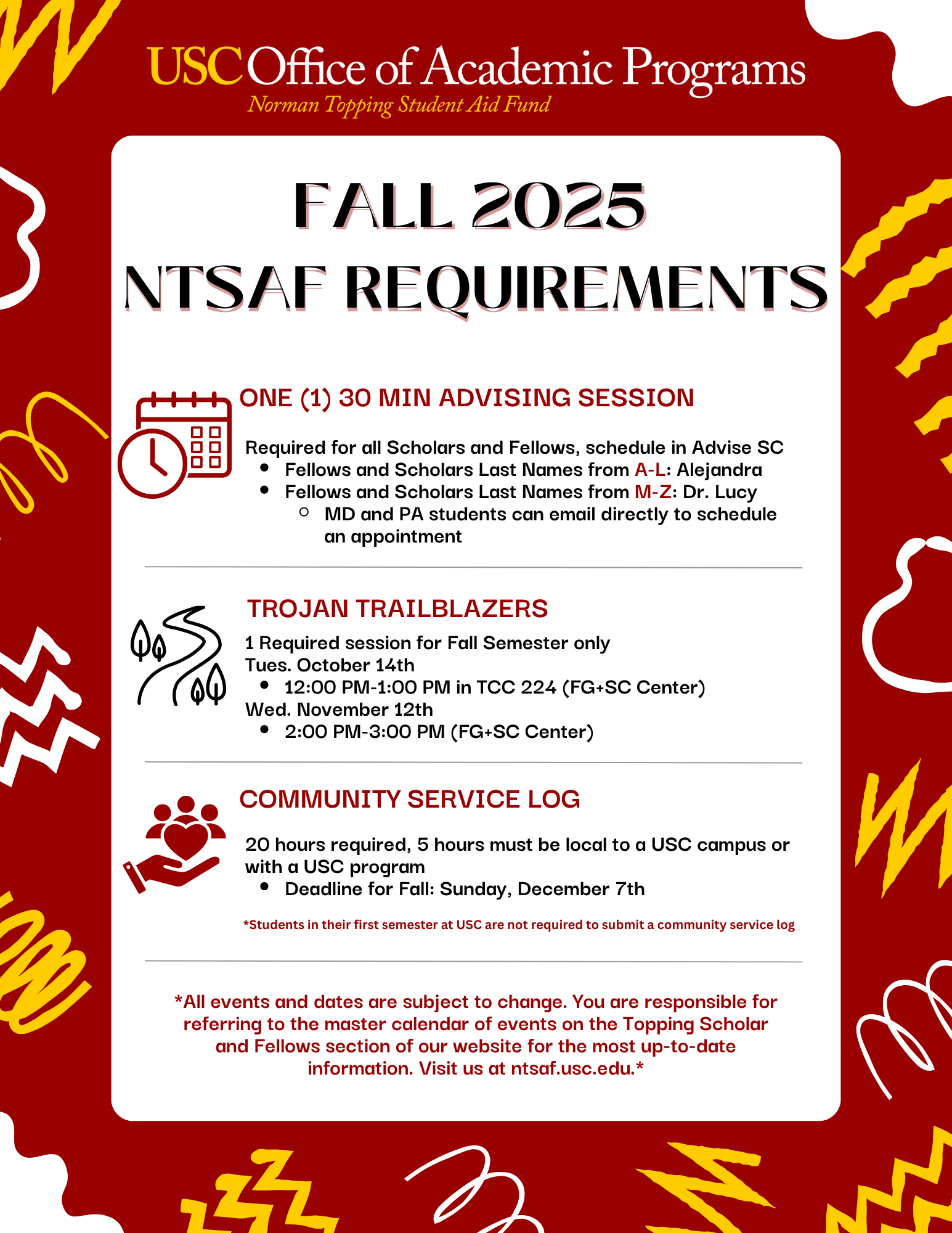 The Norman Topping Student Aid Fund (NTSAF) provides scholarships to undergraduate and graduate students at the University of Southern California to partially defray tuition and other related educational costs. The scholarship is renewable every year, provided the student attends all of the mandatory NTSAF events along with maintaining a predetermined grade point average and full-time enrollment.